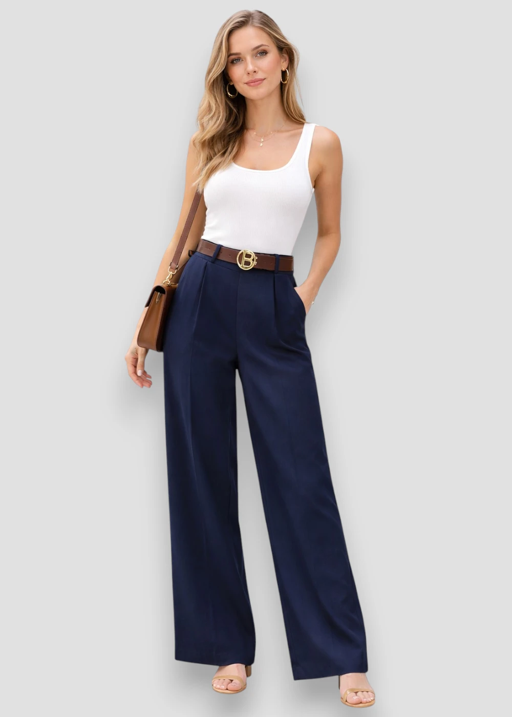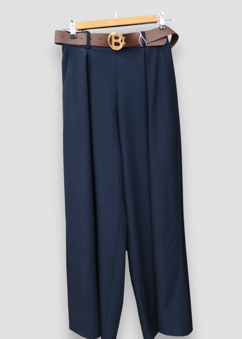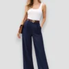 El pantalón palazzo liso azul es una prenda elegante y cómoda con corte amplio y caída fluida que estiliza la silueta.