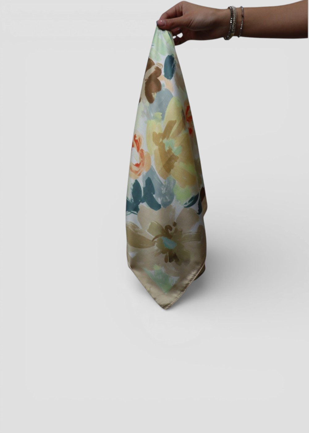 En conjunto, este pañuelo floral en tonos marrones transmite una sensación de estilo natural, delicado y contemporáneo.