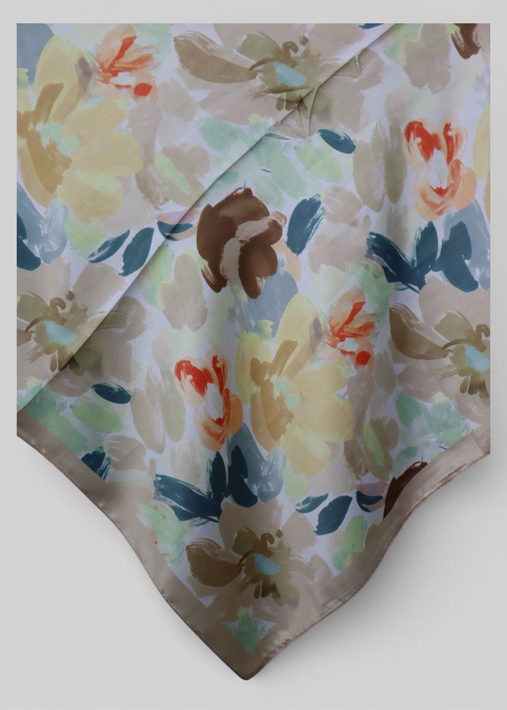 Esta disposición irregular recuerda a una pintura abstracta inspirada en la naturaleza, lo que convierte al pañuelo en un accesorio muy versátil y con personalidad.