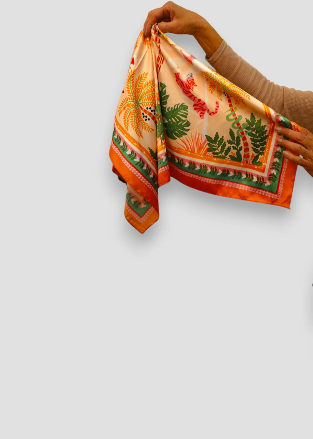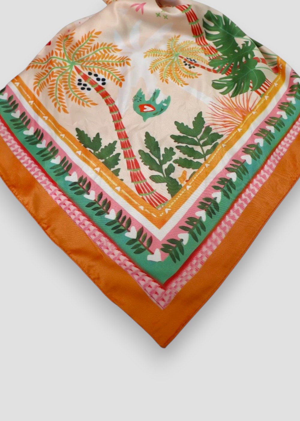 Pañuelo ligero con estampado tropical de palmeras y borde naranja, vibrante y versátil. Ideal para dar color y estilo a cualquier look.