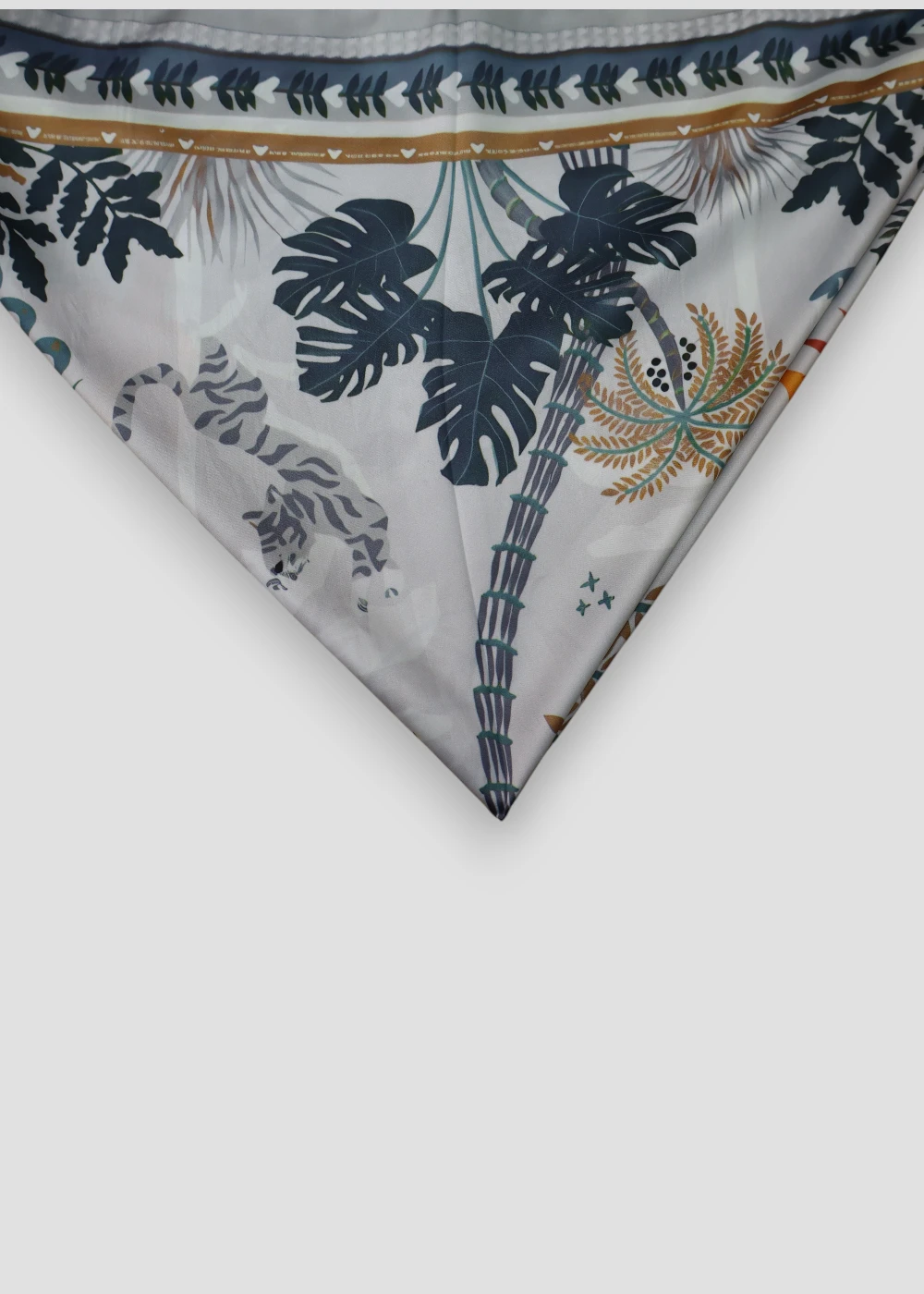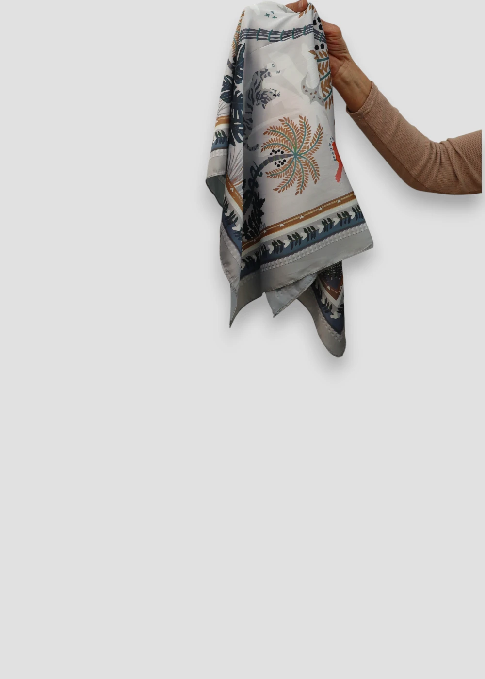 Pañuelo ligero con estampado de palmeras en tonos grises, elegante y versátil. Ideal para aportar un toque sofisticado y natural a cualquier look.
