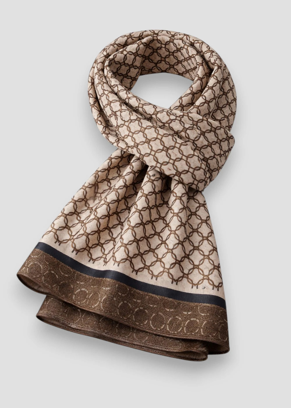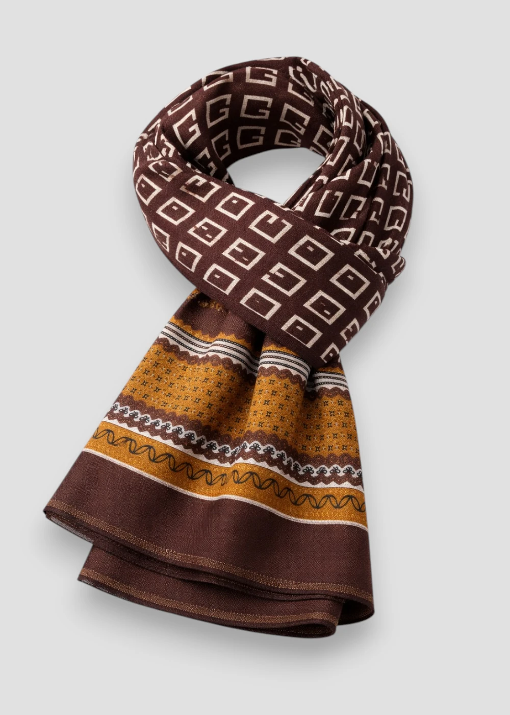 Su base en tonos marrones y neutros transmite elegancia y versatilidad, ideal para complementar atuendos tanto casuales como formales.