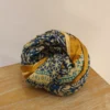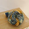 En los bordes, el pareo presenta una cenefa decorativa en tonos azul y dorado que añade un toque distintivo y sofisticado, resaltando la riqueza cultural de la prenda.