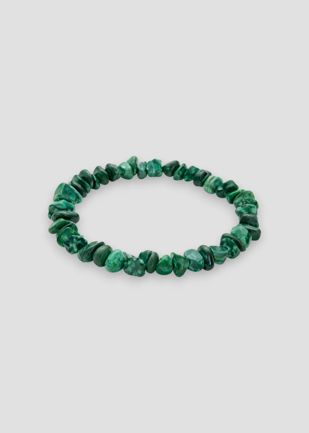 La pulsera chips de malaquita es una pieza única que destaca por su belleza natural y su carácter orgánico.