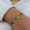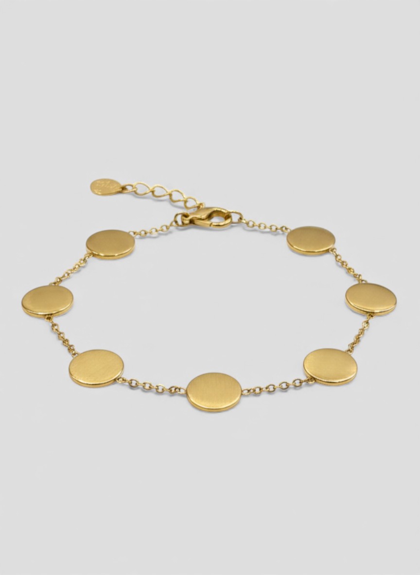 La pulsera está formada por una delicada cadena de eslabones pequeños en acabado dorado brillante, que aporta ligereza y comodidad sin renunciar a un toque de lujo. A lo largo de la pieza se distribuyen de forma armoniosa ocho discos dorados lisos, cuidadosamente pulidos para ofrecer un brillo sutil y contemporáneo. Su distribución equilibrada crea un movimiento elegante al llevarla puesta, añadiendo dinamismo y personalidad al diseño.
