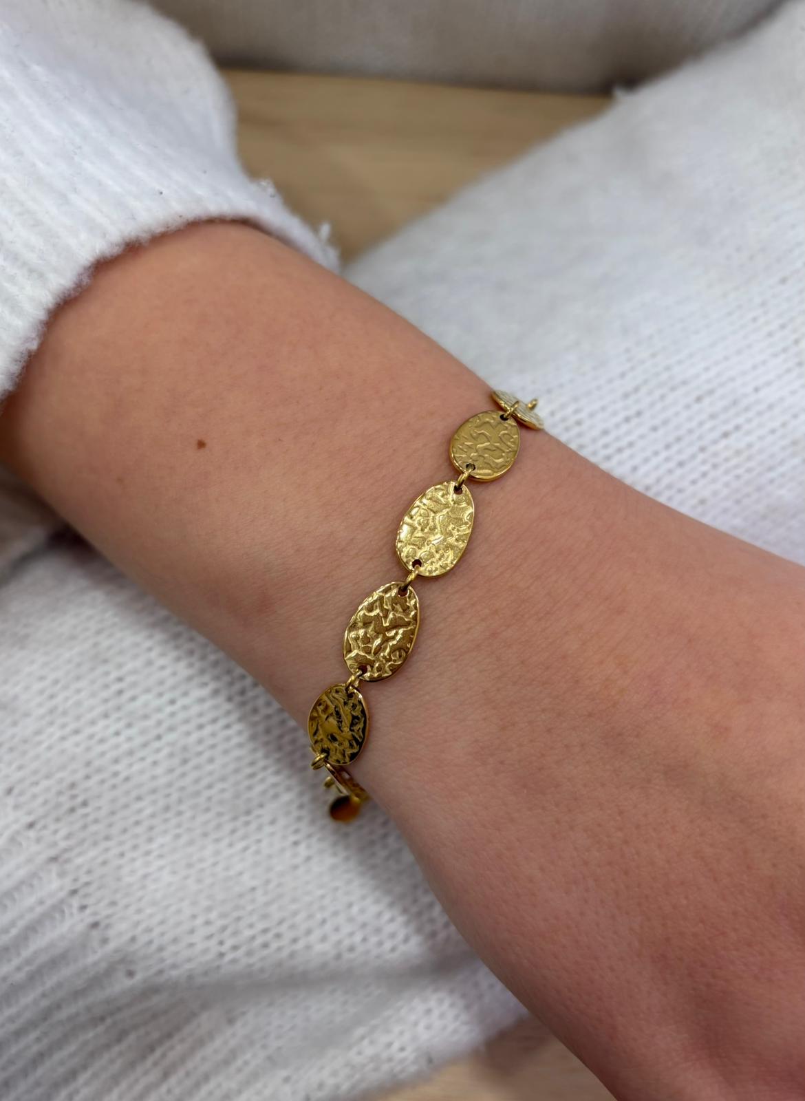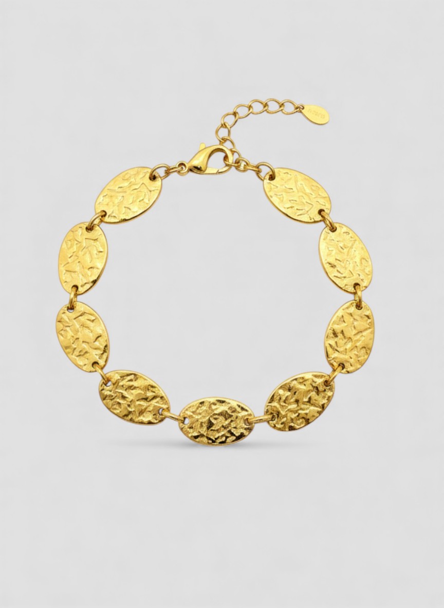 La pulsera está compuesta por una serie de ocho óvalos dorados, cada uno con una superficie texturizada que aporta profundidad, brillo y personalidad. Este acabado martillado crea un juego de reflejos que realza la pulsera con cada movimiento, añadiendo un toque dinámico y llamativo.