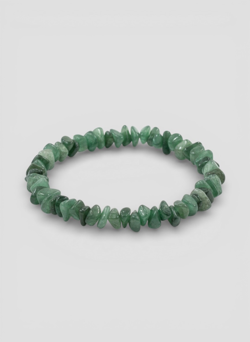 Esta pulsera está elaborada con piedra natural de cuarzo verde en formato de cuentas irregulares tipo chip, cuidadosamente seleccionadas y pulidas para resaltar su brillo y textura natural. Cada fragmento conserva formas orgánicas únicas, lo que convierte a cada pulsera en una pieza irrepetible, con carácter propio y una estética auténtica.