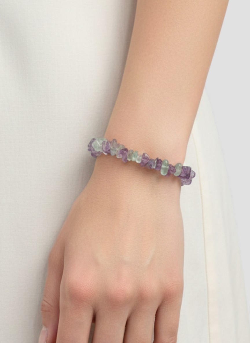Esta pulsera de fluorita natural es una pieza elegante y armoniosa que combina belleza, energía y versatilidad. Está elaborada con chips irregulares de fluorita, cuidadosamente pulidos, que muestran una delicada mezcla de tonos violetas suaves y verdes translúcidos, creando un efecto visual único y natural. Cada cuenta conserva las vetas y matices propios de la piedra, lo que hace que no existan dos pulseras iguales.