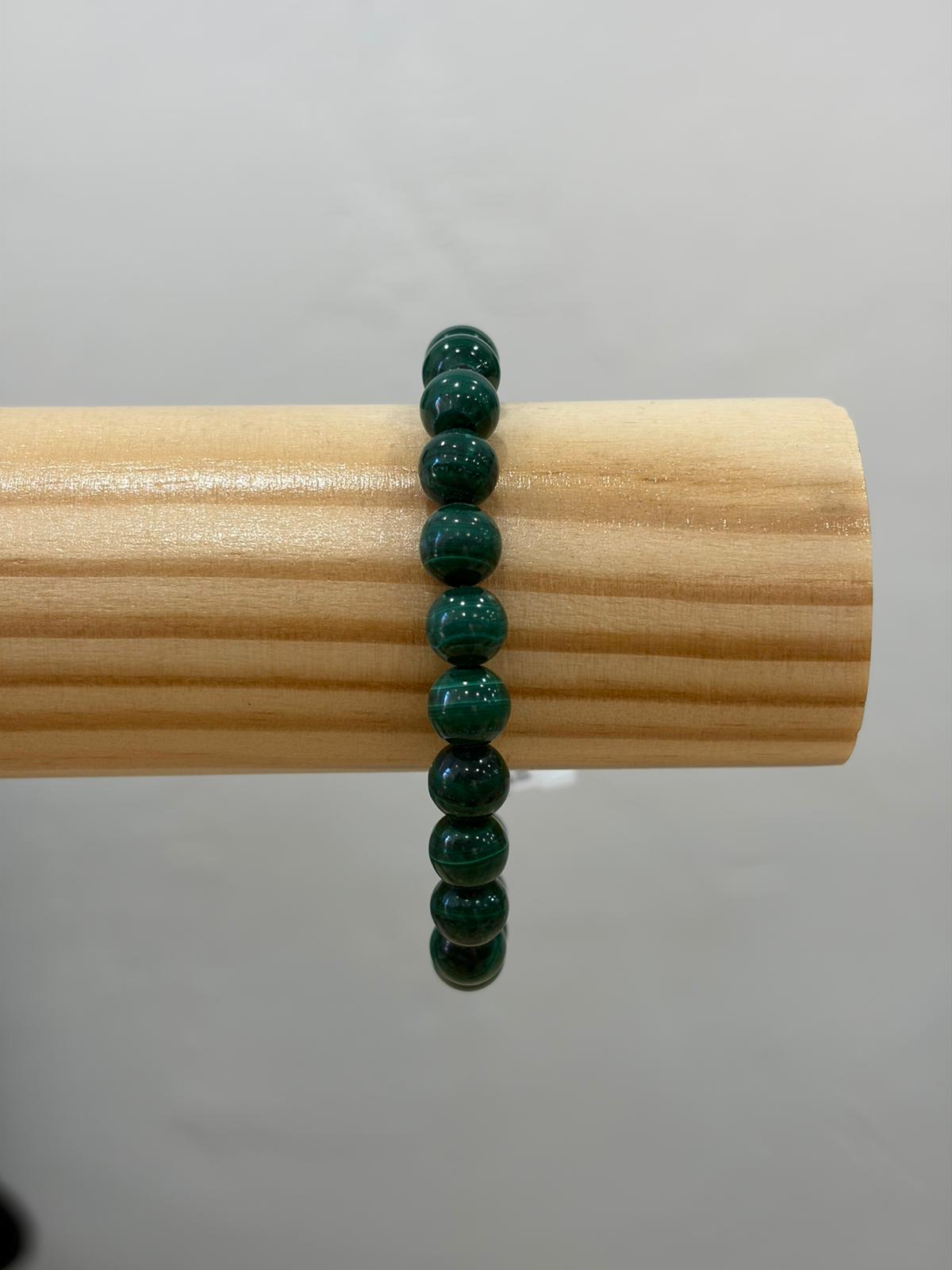 Esta elegante pulsera está elaborada con malaquita natural, una piedra reconocida por su intenso color verde y sus características vetas y bandas concéntricas que crean un dibujo único en cada cuenta. Las cuentas esféricas, cuidadosamente talladas y pulidas, presentan un acabado brillante que realza la profundidad del color y la belleza natural de la piedra.