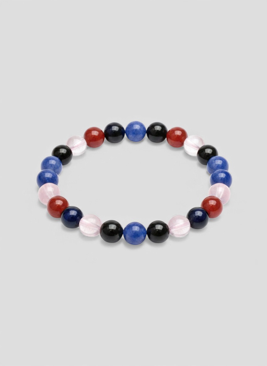 Pulsera elástica de mix chakras con tonos azul, rojo, negro y cristal. Diseño moderno, vibrante y versátil, perfecta para cualquier estilo.