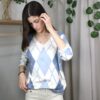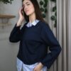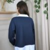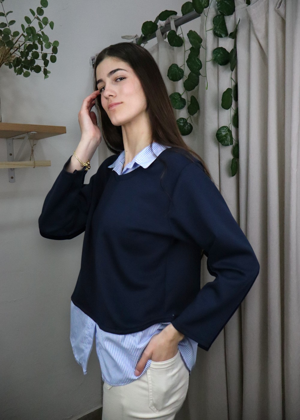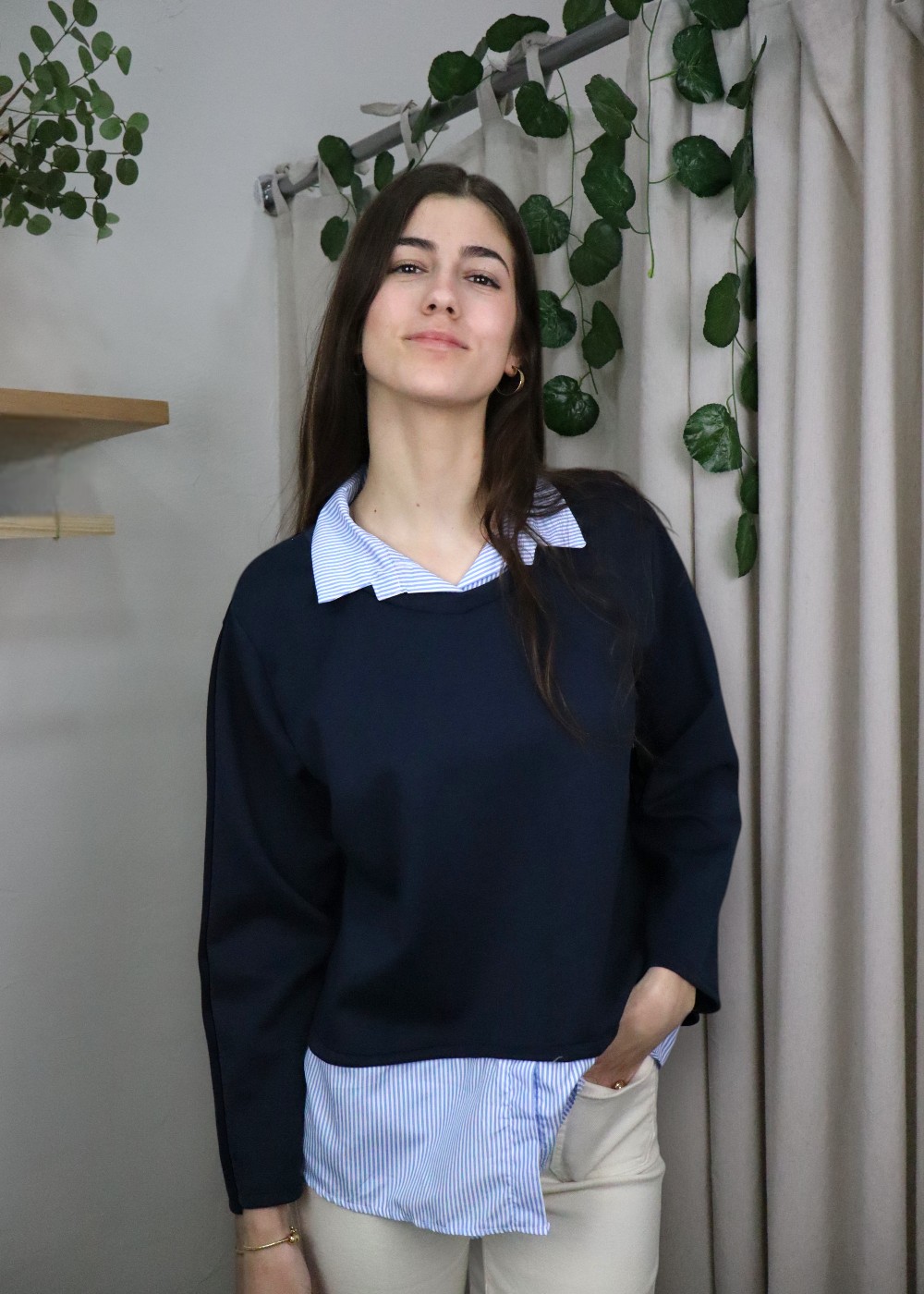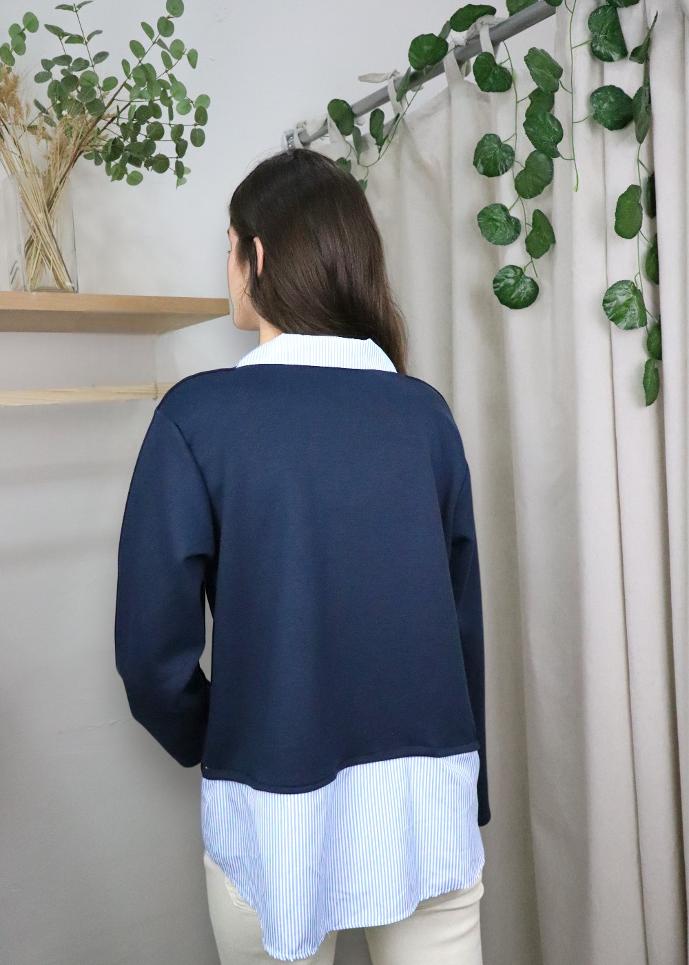 El cuello tipo camisa con rayas finas en azul y blanco aporta contraste y añade un toque clásico al conjunto, mientras que el bajo visible de la camisa refuerza este efecto de superposición.