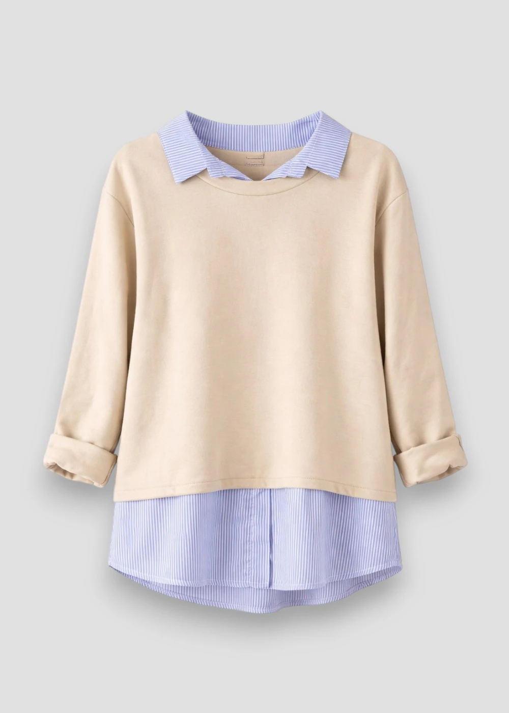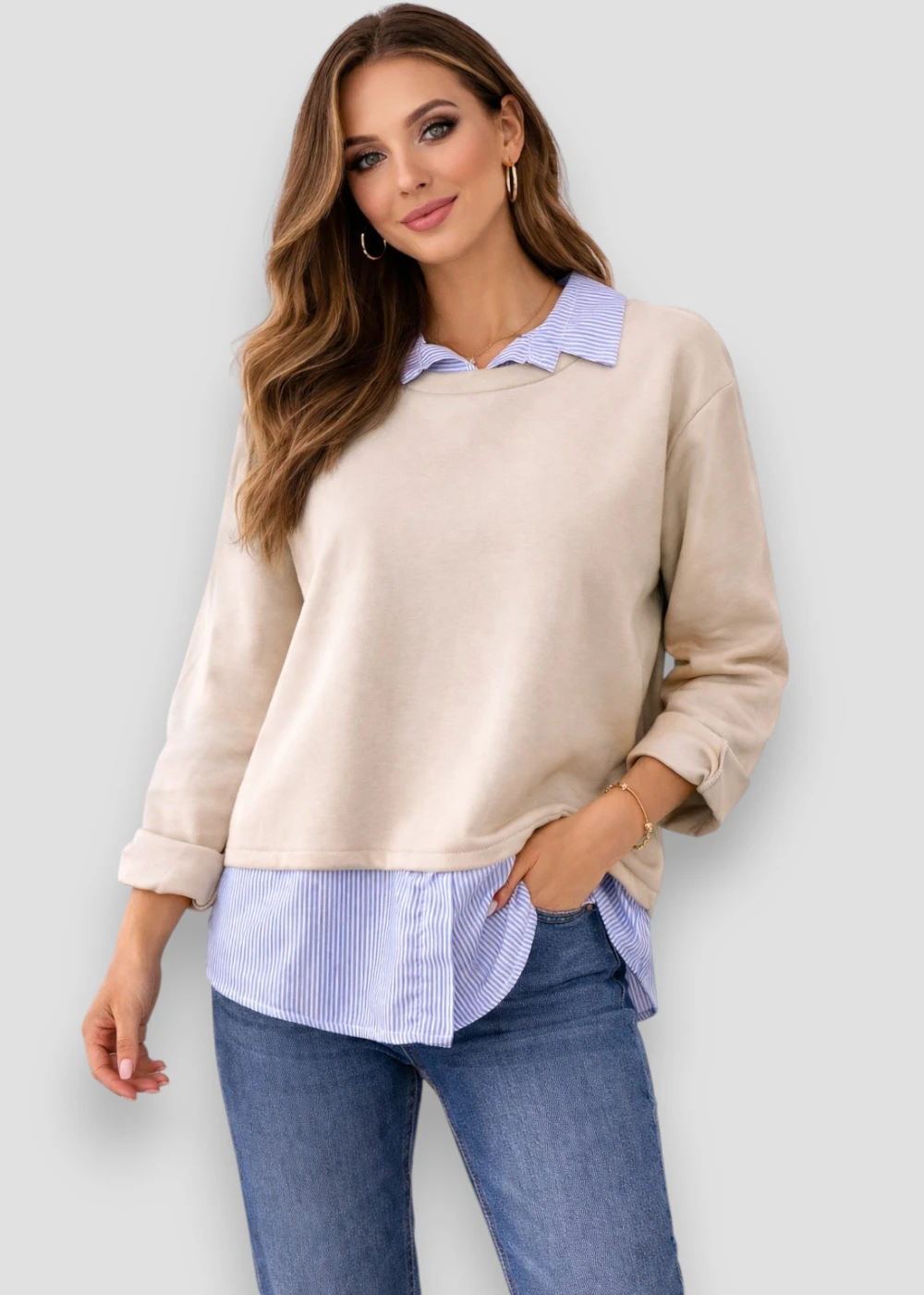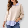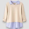 El bajo con efecto camisa visible añade dinamismo y profundidad al conjunto, siguiendo una tendencia muy popular en la moda contemporánea.