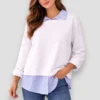 Además, el bajo de la prenda incorpora también un tejido de camisa a rayas que crea un atractivo efecto de capas, una tendencia muy popular en la moda actual.
