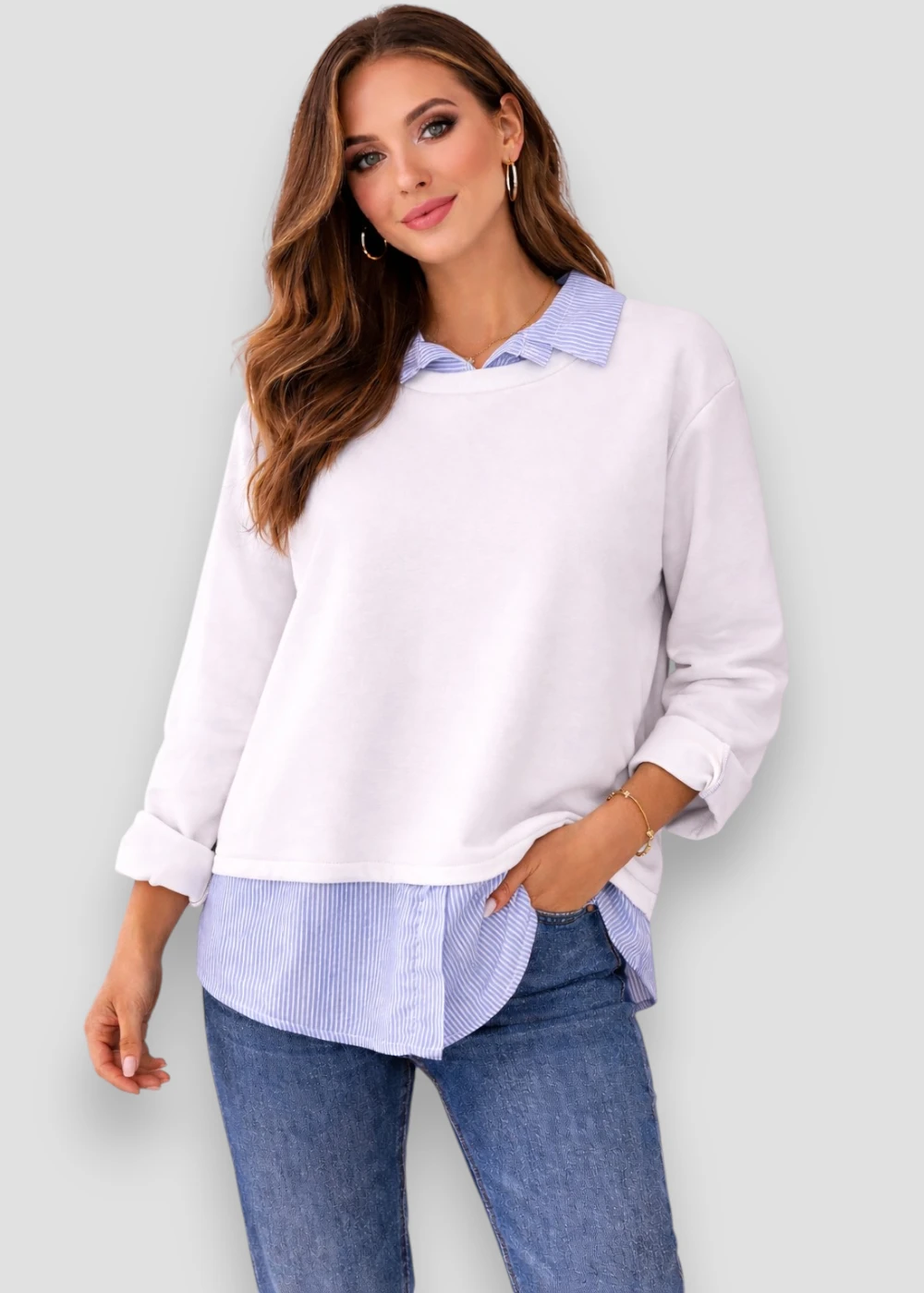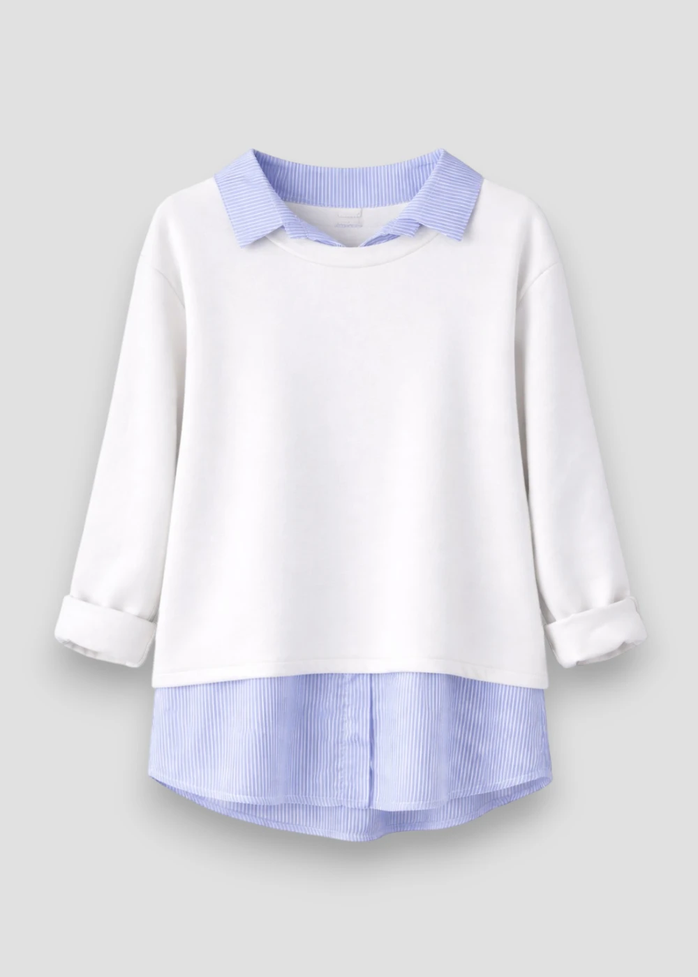 Uno de los detalles más característicos de la Sudadera Urban Blanca es el cuello camisero con estampado de rayas en tonos azul y blanco, que aporta un contraste elegante y moderno al conjunto.
