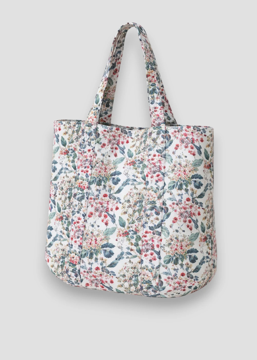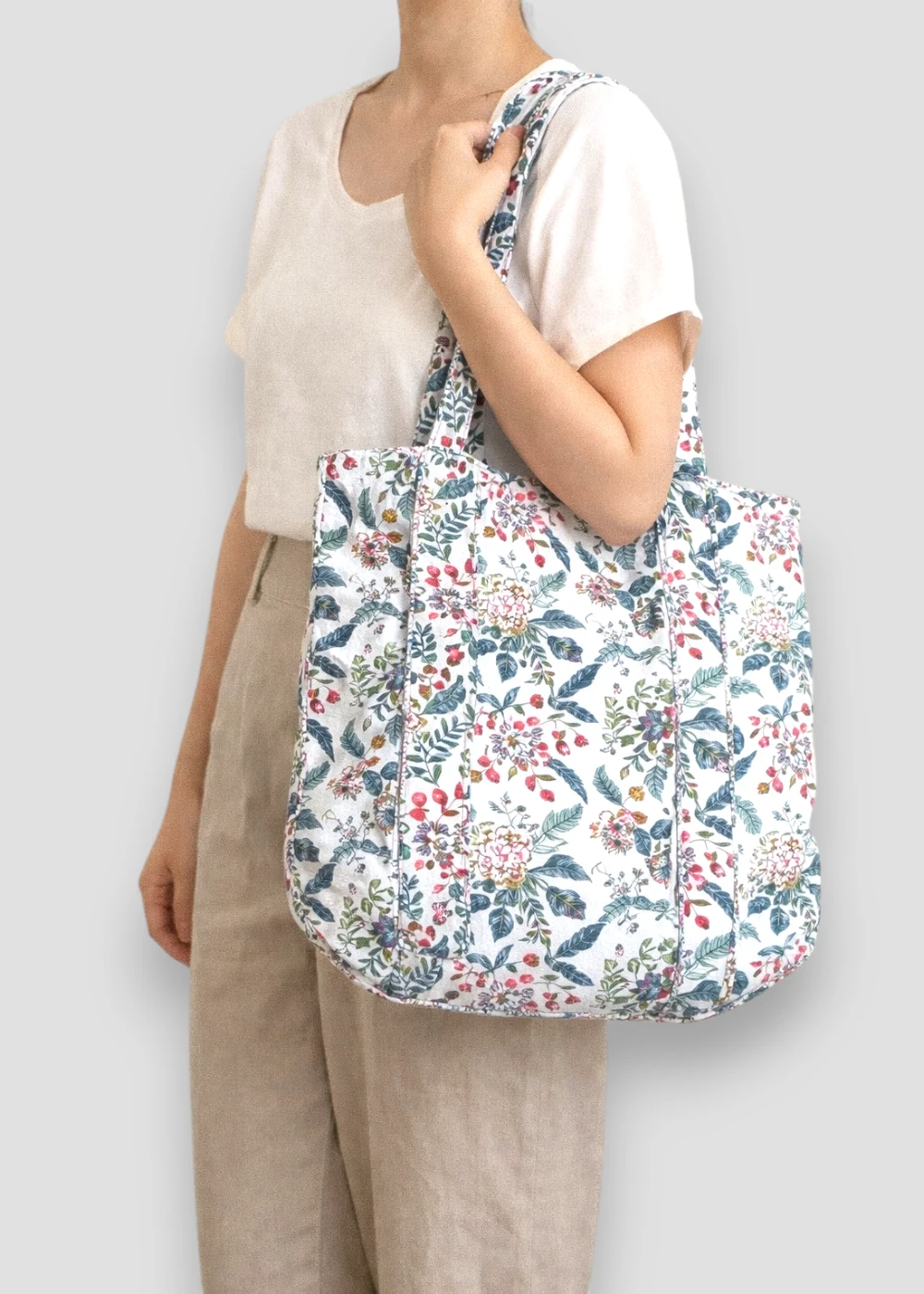 Confeccionada en tela resistente de alta calidad, esta bolsa destaca por su diseño floral delicado y elegante, donde predominan tonos suaves que evocan frescura y naturalidad.