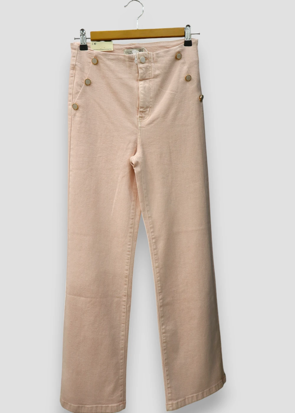 Uno de los detalles más distintivos de este modelo es su decoración con botones metálicos dorados en la parte frontal de la cintura, que añade un toque sofisticado y original al diseño.