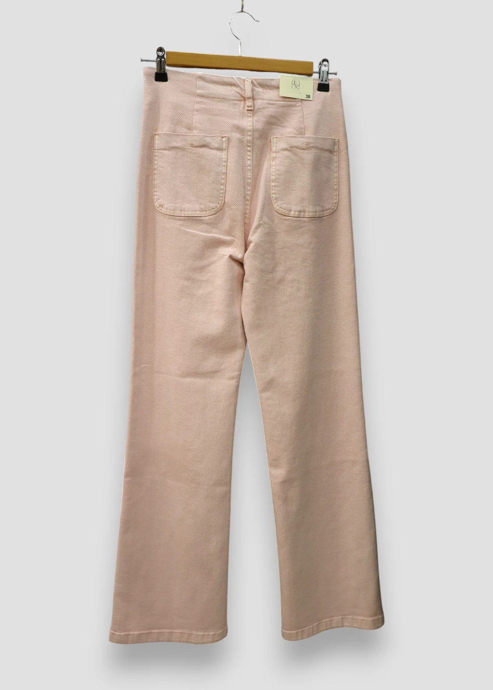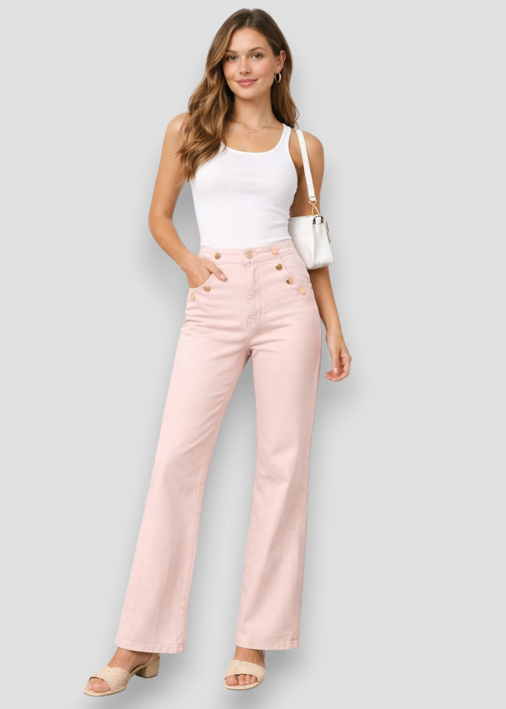 Su delicado tono rosa empolvado aporta un estilo suave y moderno, ideal para quienes buscan una alternativa diferente al clásico denim sin perder versatilidad.