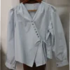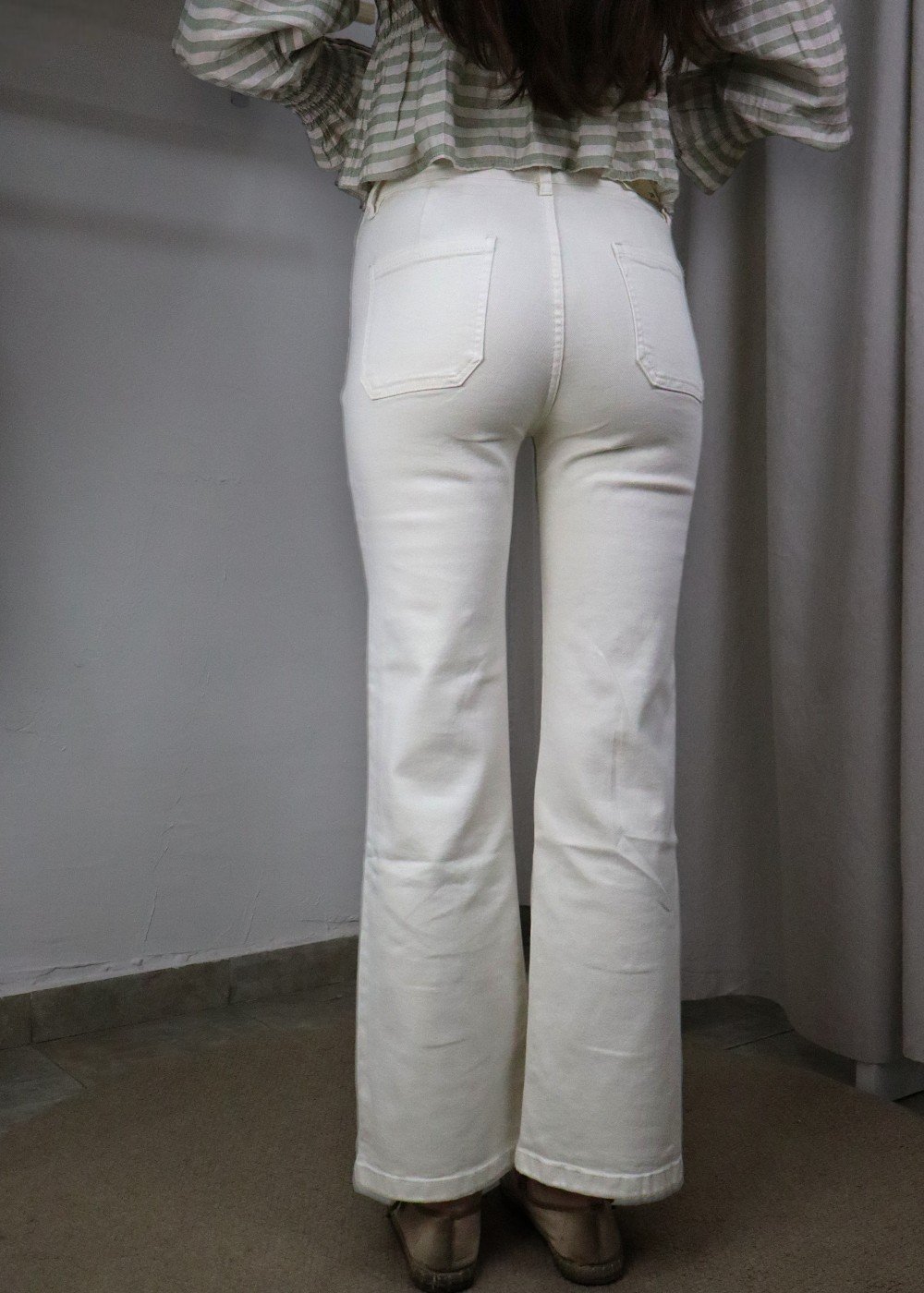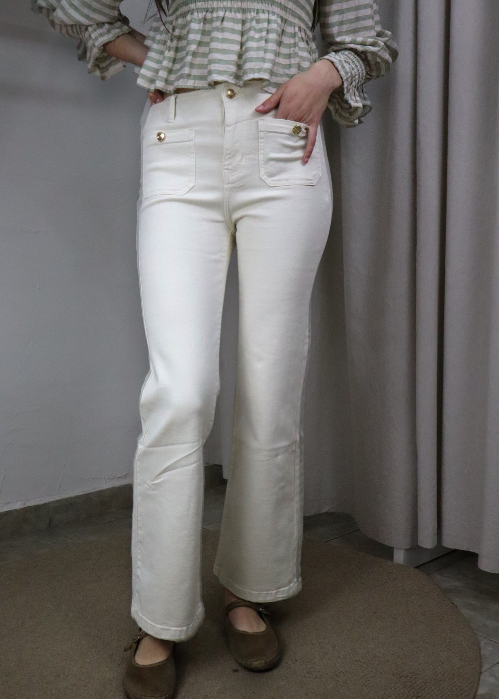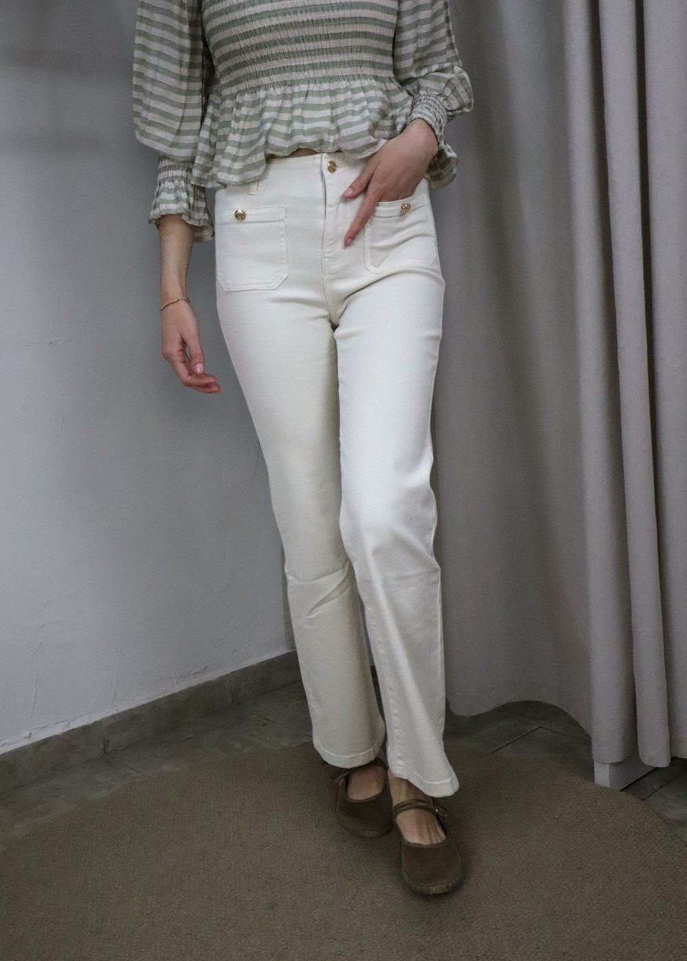Vaquero María blanco roto de corte recto ligeramente acampanado, con bolsillos frontales y botones decorativos. Pantalón elegante, cómodo y versátil, ideal para looks casuales o sofisticados.
