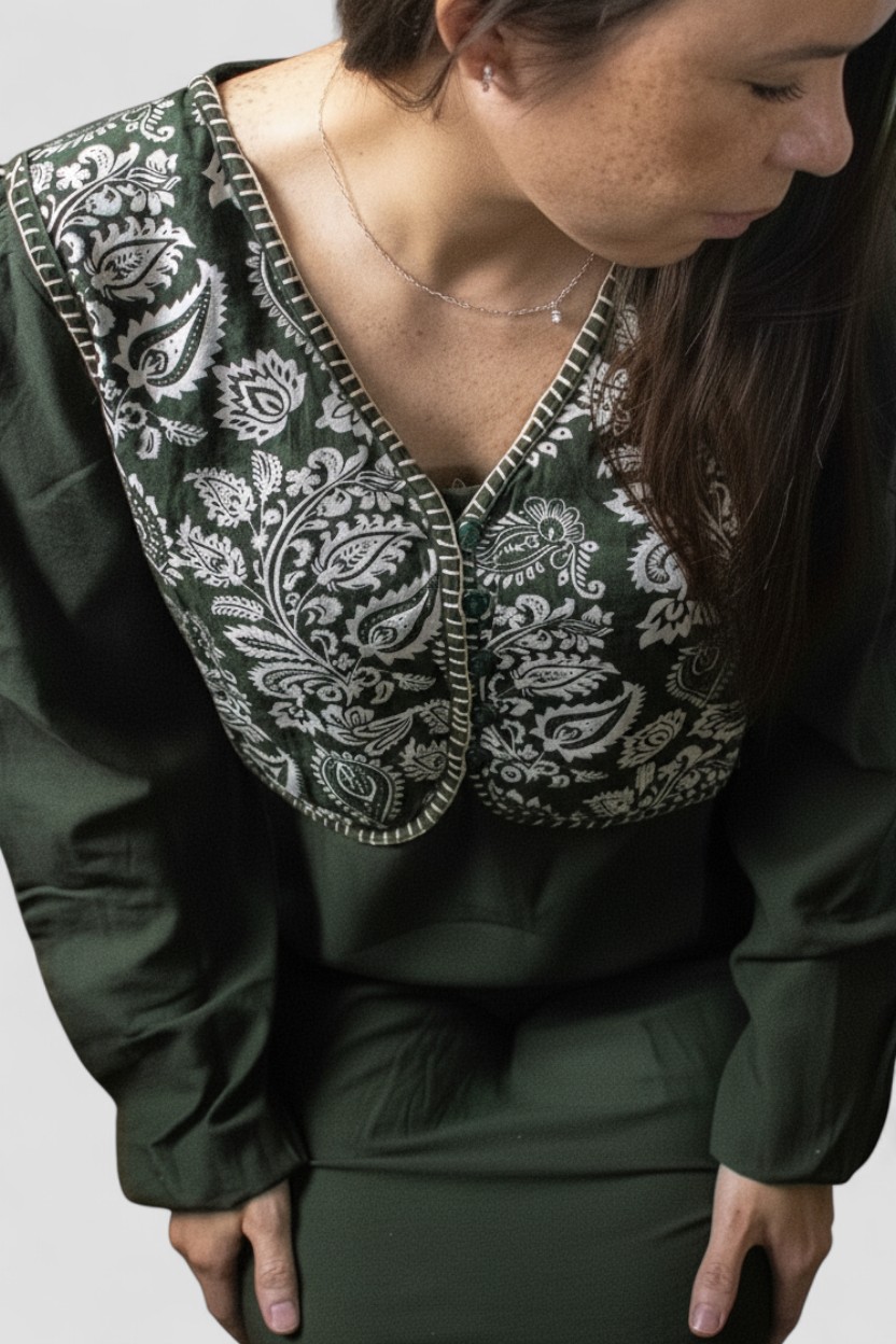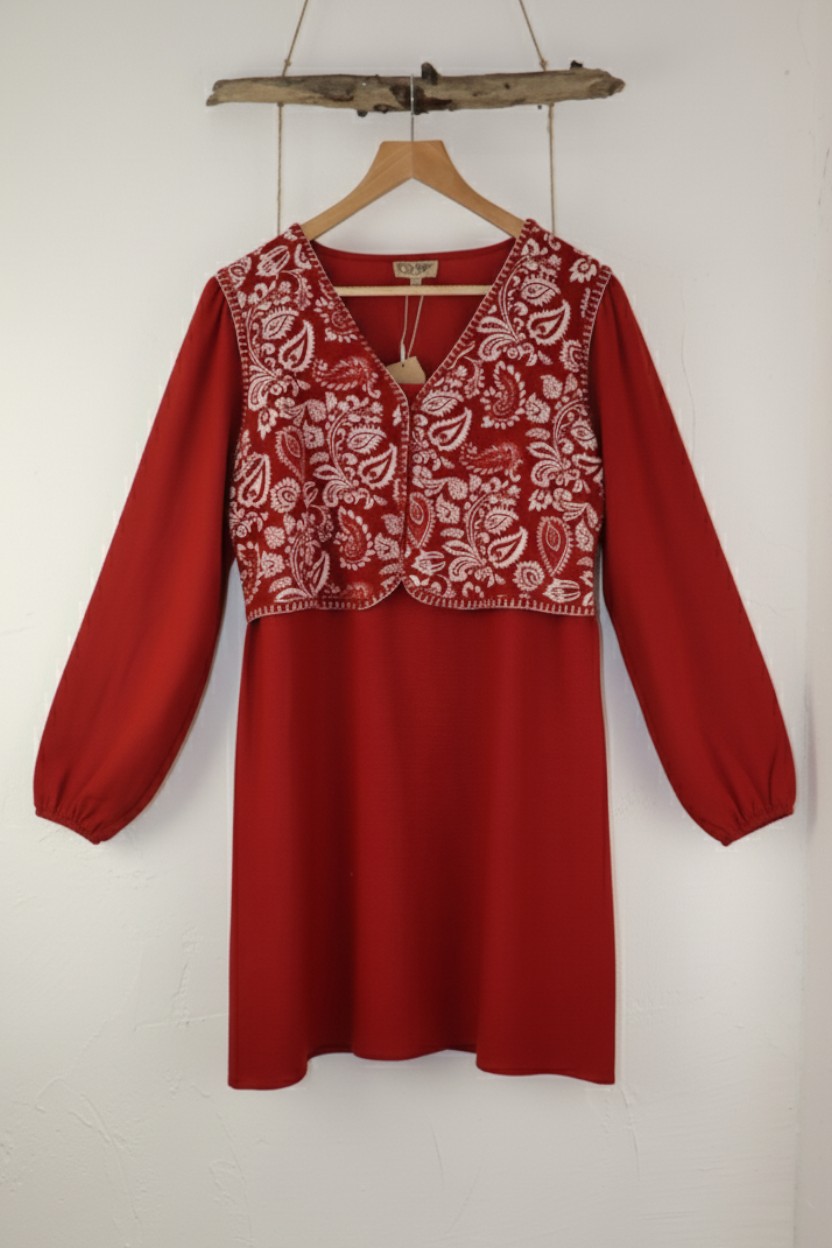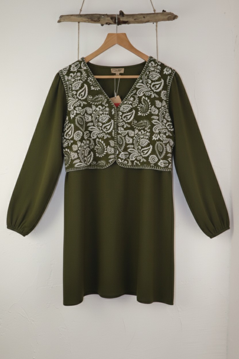 Vestido Country, descubre un diseño que combina sofisticación, frescura y un toque artesanal. Este Vestido Country destaca por su espectacular pechera bordada a contraste, con motivos florales y hojas que aportan un aire elegante y único.