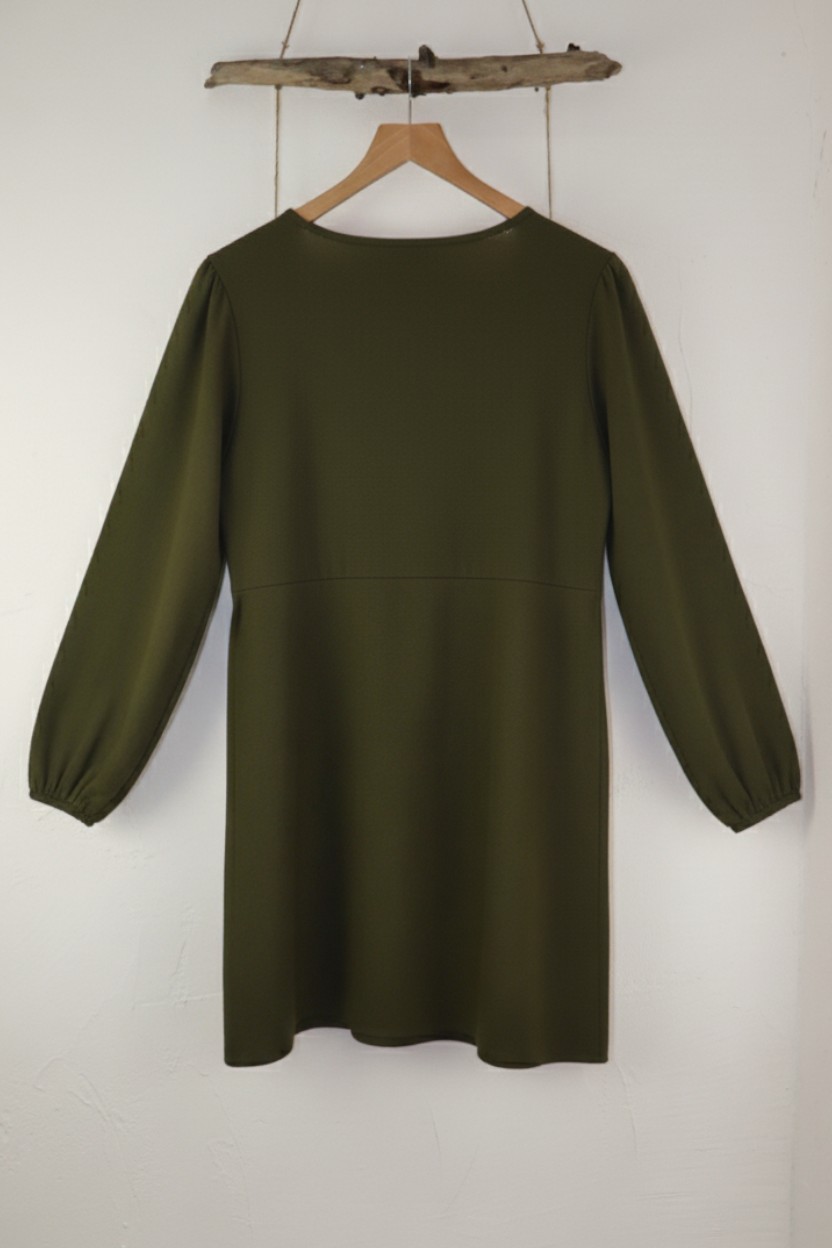 Confeccionado en un tejido suave y fluido, este vestido ofrece una caída ligera que estiliza la figura sin ajustarse demasiado, brindando comodidad y libertad de movimiento.